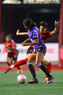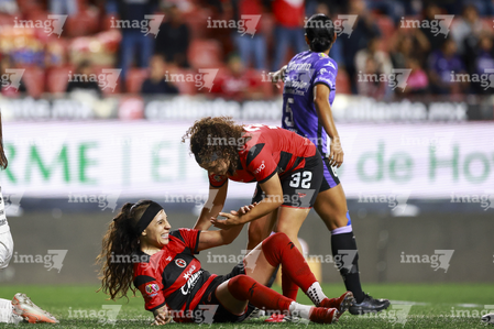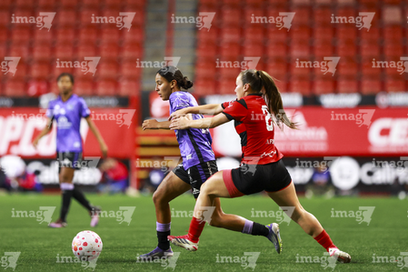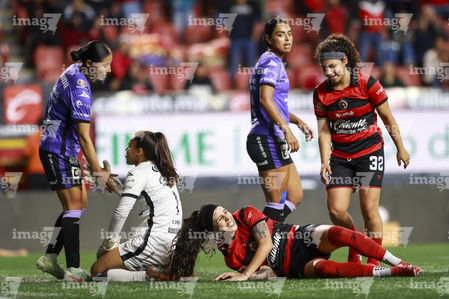 Tijuana, Baja California, 24 de abril de 2026. Alondra García y Karen De León, durante el partido correspondiente a la jornada 17 del torneo Clausura 2026 de la Liga BBVA MX Femenil, entre las Xolas de Tijuana y las Cañoneras del Mazatlán FC, realizado en el estadio Caliente. Foto: Imago7/Alejandro Gutiérrez Mora