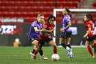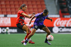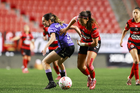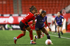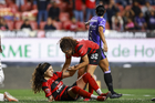 Tijuana, Baja California, 24 de abril de 2026. Danielle Fuentes y Brenda Aleman, durante el partido correspondiente a la jornada 17 del torneo Clausura 2026 de la Liga BBVA MX Femenil, entre las Xolas de Tijuana y las Cañoneras del Mazatlán FC, realizado en el estadio Caliente. Foto: Imago7/ David Vega