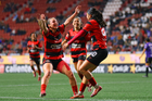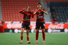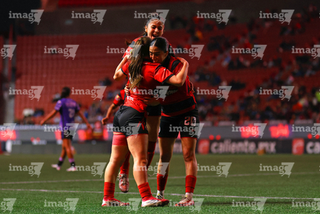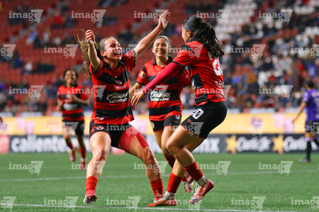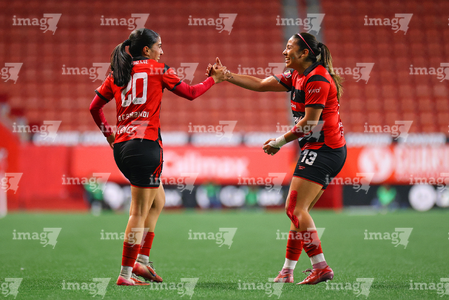 Tijuana, Baja California, 24 de abril de 2026. Michel Fong y Daniela Carrandi en festejo de gol, durante el partido correspondiente a la jornada 17 del torneo Clausura 2026 de la Liga BBVA MX Femenil, entre las Xolas de Tijuana y las Cañoneras del Mazatlán FC, realizado en el estadio Caliente. Foto: Imago7/ David Vega