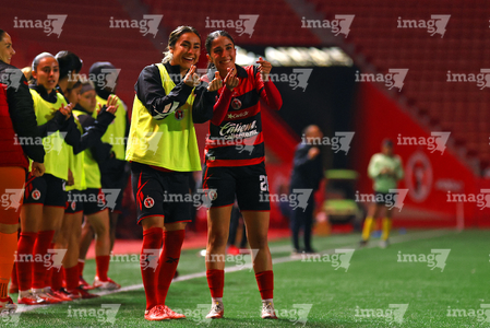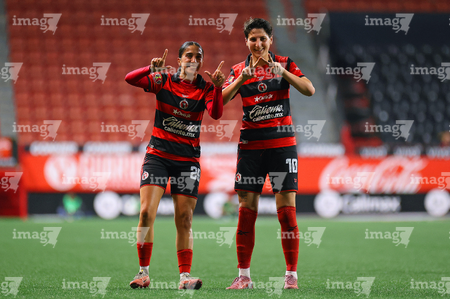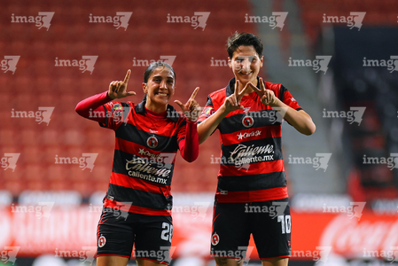 Tijuana, Baja California, 24 de abril de 2026. Daniela Carrandi y Dana Sandoval en festejo de gol, durante el partido correspondiente a la jornada 17 del torneo Clausura 2026 de la Liga BBVA MX Femenil, entre las Xolas de Tijuana y las Cañoneras del Mazatlán FC, realizado en el estadio Caliente. Foto: Imago7/ David Vega