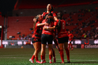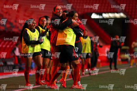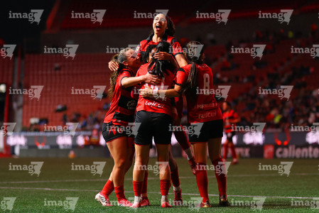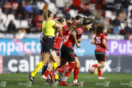 Tijuana, Baja California, 24 de abril de 2026. Jugadoras de Xolas en festejo de gol, durante el partido correspondiente a la jornada 17 del torneo Clausura 2026 de la Liga BBVA MX Femenil, entre las Xolas de Tijuana y las Cañoneras del Mazatlán FC, realizado en el estadio Caliente. Foto: Imago7/ David Vega