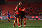 Tijuana, Baja California, 24 de abril de 2026. Daniela Carrandi y Kader Hançar en festejo de gol, durante el partido correspondiente a la jornada 17 del torneo Clausura 2026 de la Liga BBVA MX Femenil, entre las Xolas de Tijuana y las Cañoneras del Mazatlán FC, realizado en el estadio Caliente. Foto: Imago7/ David Vega