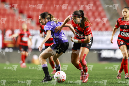 Tijuana, Baja California, 24 de abril de 2026. María Canseco y Kader Hançar, durante el partido correspondiente a la jornada 17 del torneo Clausura 2026 de la Liga BBVA MX Femenil, entre las Xolas de Tijuana y las Cañoneras del Mazatlán FC, realizado en el estadio Caliente. Foto: Imago7/ David Vega