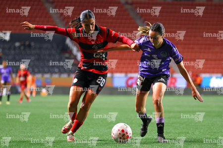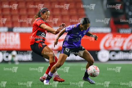 Tijuana, Baja California, 24 de abril de 2026. Dana Sandoval y Brenda Aleman, durante el partido correspondiente a la jornada 17 del torneo Clausura 2026 de la Liga BBVA MX Femenil, entre las Xolas de Tijuana y las Cañoneras del Mazatlán FC, realizado en el estadio Caliente. Foto: Imago7/ David Vega