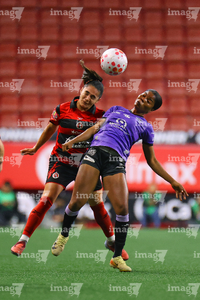 Tijuana, Baja California, 24 de abril de 2026. Jazmín Enrigue y Taiwo Lawal, durante el partido correspondiente a la jornada 17 del torneo Clausura 2026 de la Liga BBVA MX Femenil, entre las Xolas de Tijuana y las Cañoneras del Mazatlán FC, realizado en el estadio Caliente. Foto: Imago7/ David Vega