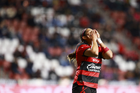 Tijuana, Baja California, 24 de abril de 2026. Michel Fong en lamento, durante el partido correspondiente a la jornada 17 del torneo Clausura 2026 de la Liga BBVA MX Femenil, entre las Xolas de Tijuana y las Cañoneras del Mazatlán FC, realizado en el estadio Caliente. Foto: Imago7/ David Vega