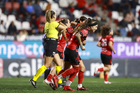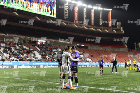 Tijuana, Baja California, 24 de abril de 2026. Jugadoras de Xolas y Jugadoras del Mazatlán femenil durante el partido correspondiente a la jornada 17 del torneo Clausura 2026 de la Liga BBVA MX Femenil, entre las Xolas de Tijuana y las Cañoneras del Mazatlán FC, realizado en el estadio Caliente. Foto: Imago7/ David Vega
