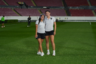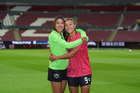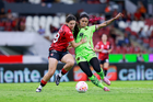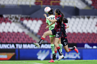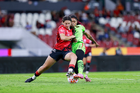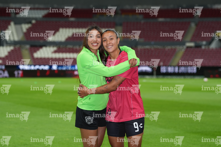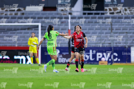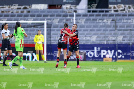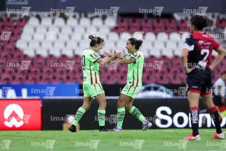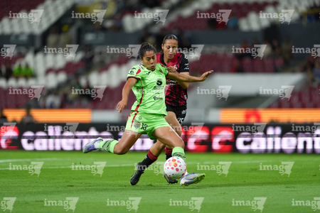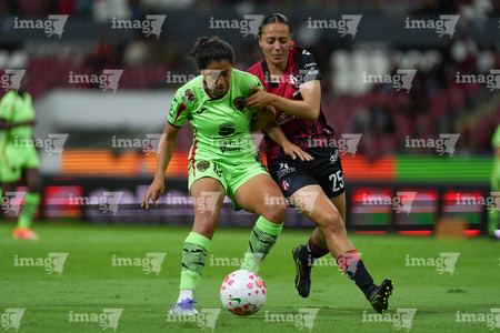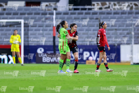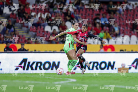 Guadalajara, Jalisco, 24 de abril de 2026. Giselle Espinoza y Bianca Mora, durante el partido correspondiente a la jornada 17 del torneo Clausura 2026 de la Liga BBVA MX Femenil, entre las Rojinegras del Atlas y las Bravas de FC Juárez, realizado en el estadio Jalisco. Foto: Imago7/Andrés Sepúlveda