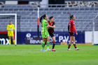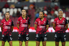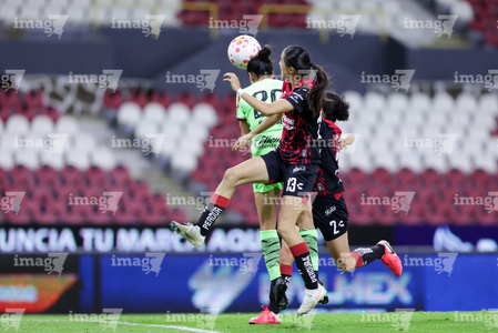 Guadalajara, Jalisco, 24 de abril de 2026. Giselle Espinoza, Akane Lara y Ella Sanchez, durante el partido correspondiente a la jornada 17 del torneo Clausura 2026 de la Liga BBVA MX Femenil, entre las Rojinegras del Atlas y las Bravas de FC Juárez, realizado en el estadio Jalisco. Foto: Imago7/Andrés Sepúlveda