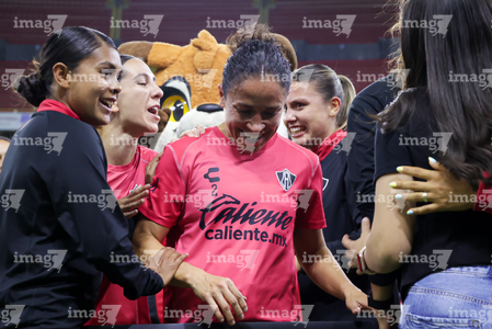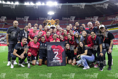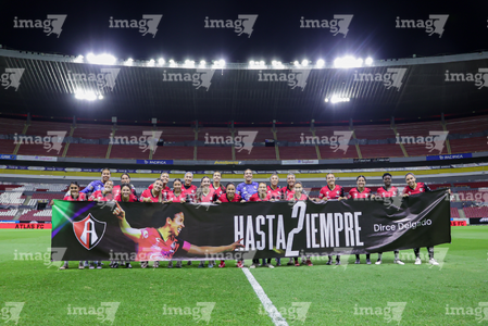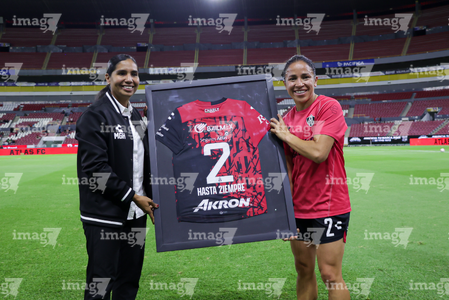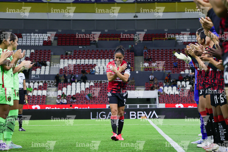 Guadalajara, Jalisco, 24 de abril de 2026. Dirce Delgado recibió un reconocimiento por su retiro, durante el partido correspondiente a la jornada 17 del torneo Clausura 2026 de la Liga BBVA MX Femenil, entre las Rojinegras del Atlas y las Bravas de FC Juárez, realizado en el estadio Jalisco. Foto Imago7/ Jair Terán