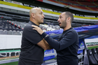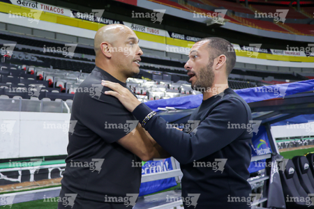 Guadalajara, Jalisco, 24 de abril de 2026. Juan Pablo Alfaro, director técnico y Oscar Fernández, director técnico, durante el partido correspondiente a la jornada 17 del torneo Clausura 2026 de la Liga BBVA MX Femenil, entre las Rojinegras del Atlas y las Bravas de FC Juárez, realizado en el estadio Jalisco. Foto Imago7/ Jair Terán