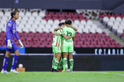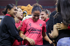 Guadalajara, Jalisco, 24 de abril de 2026. Jugadoras del FC Juárez femenil en festejo de gol, durante el partido correspondiente a la jornada 17 del torneo Clausura 2026 de la Liga BBVA MX Femenil, entre las Rojinegras del Atlas y las Bravas de FC Juárez, realizado en el estadio Jalisco. Foto Imago7/ Jair Terán
