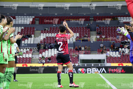 Guadalajara, Jalisco, 24 de abril de 2026. Dirce Delgado se retiró como futbolista profesional, durante el partido correspondiente a la jornada 17 del torneo Clausura 2026 de la Liga BBVA MX Femenil, entre las Rojinegras del Atlas y las Bravas de FC Juárez, realizado en el estadio Jalisco. Foto Imago7/ Jair Terán