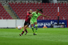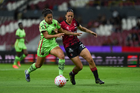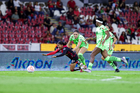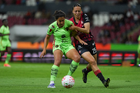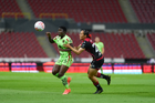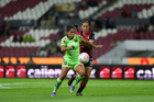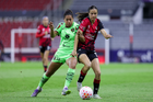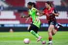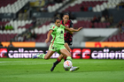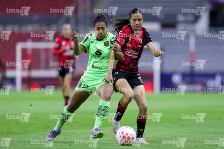 Guadalajara, Jalisco, 24 de abril de 2026. Akane Lara y Dayana Martin, durante el partido correspondiente a la jornada 17 del torneo Clausura 2026 de la Liga BBVA MX Femenil, entre las Rojinegras del Atlas y las Bravas de FC Juárez, realizado en el estadio Jalisco. Foto Imago7/ Jair Terán