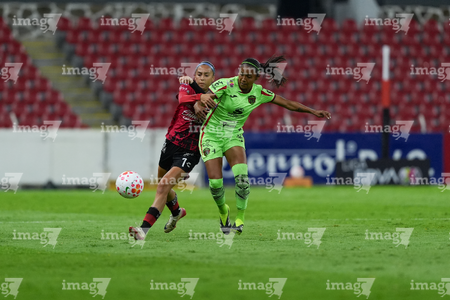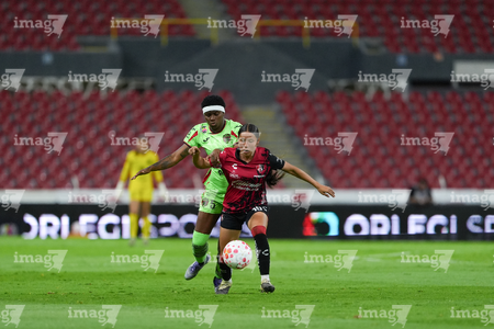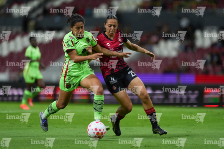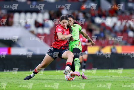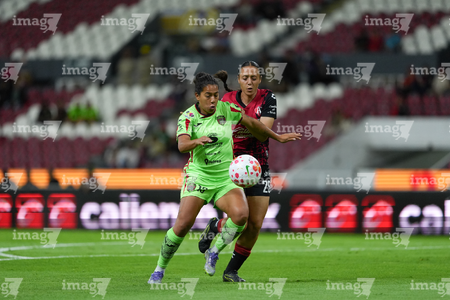 Guadalajara, Jalisco, 24 de abril de 2026. Aisha Solorzano y Daniela Meza, durante el partido correspondiente a la jornada 17 del torneo Clausura 2026 de la Liga BBVA MX Femenil, entre las Rojinegras del Atlas y las Bravas de FC Juárez, realizado en el estadio Jalisco. Foto: Imago7/Andrés Sepúlveda