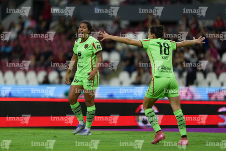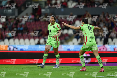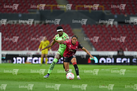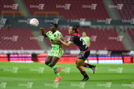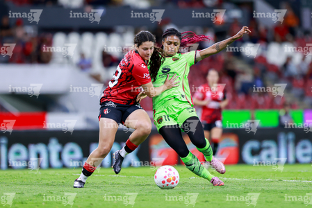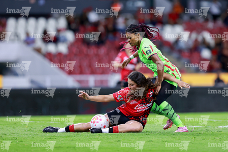 Guadalajara, Jalisco, 24 de abril de 2026. Dayana Martin y Akane Lara, durante el partido correspondiente a la jornada 17 del torneo Clausura 2026 de la Liga BBVA MX Femenil, entre las Rojinegras del Atlas y las Bravas de FC Juárez, realizado en el estadio Jalisco. Foto Imago7/ Jair Terán