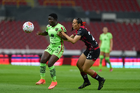 Guadalajara, Jalisco, 24 de abril de 2026. Grace Asantewaa y Daniela Meza, durante el partido correspondiente a la jornada 17 del torneo Clausura 2026 de la Liga BBVA MX Femenil, entre las Rojinegras del Atlas y las Bravas de FC Juárez, realizado en el estadio Jalisco. Foto: Imago7/Andrés Sepúlveda