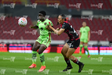 Guadalajara, Jalisco, 24 de abril de 2026. Aisha Solorzano y Maritza Maldonado, durante el partido correspondiente a la jornada 17 del torneo Clausura 2026 de la Liga BBVA MX Femenil, entre las Rojinegras del Atlas y las Bravas de FC Juárez, realizado en el estadio Jalisco. Foto Imago7/ Jair Terán