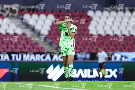 Guadalajara, Jalisco, 24 de abril de 2026. Dayana Martin en lamento, durante el partido correspondiente a la jornada 17 del torneo Clausura 2026 de la Liga BBVA MX Femenil, entre las Rojinegras del Atlas y las Bravas de FC Juárez, realizado en el estadio Jalisco. Foto Imago7/ Jair Terán