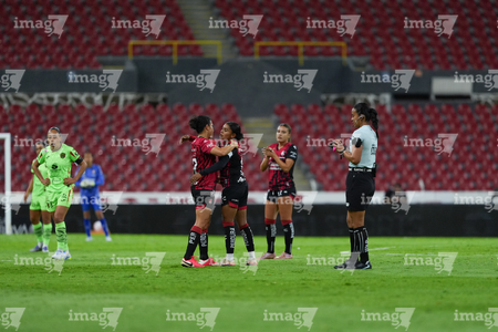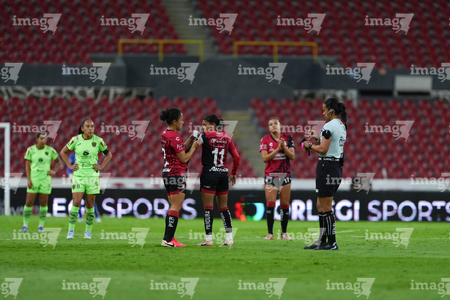 Guadalajara, Jalisco, 24 de abril de 2026. Noemí Granados en reclamo, durante el partido correspondiente a la jornada 17 del torneo Clausura 2026 de la Liga BBVA MX Femenil, entre las Rojinegras del Atlas y las Bravas de FC Juárez, realizado en el estadio Jalisco. Foto: Imago7/Andrés Sepúlveda