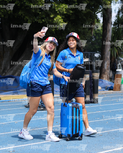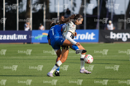 Ciudad de México, 25 de abril de 2026. Montserrat Hernández y Jashia López, durante el partido correspondiente a la jornada 17 del torneo Clausura 2026 de la Liga BBVA MX Femenil, entre la Máquina Celeste del Cruz Azul y las Pumas de la UNAM, realizado en el estadio de la Unidad Deportiva Centenario. Foto: Imago7/ Daniel Sydney