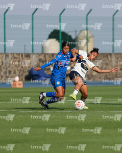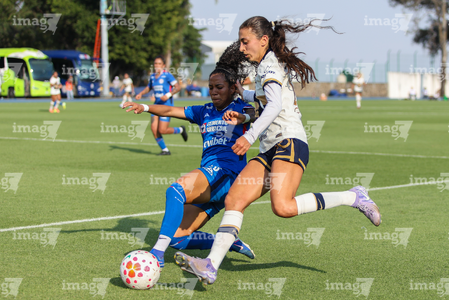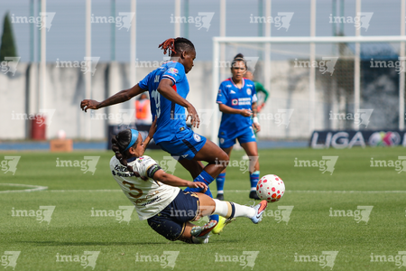 Ciudad de México, 25 de abril de 2026. Cristina Torres y Stephanie Ribeiro, durante el partido correspondiente a la jornada 17 del torneo Clausura 2026 de la Liga BBVA MX Femenil, entre la Máquina Celeste del Cruz Azul y las Pumas de la UNAM, realizado en el estadio de la Unidad Deportiva Centenario. Foto: Imago7/ Daniel Sydney
