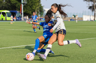 Ciudad de México, 25 de abril de 2026. Silvana Flores y Angelina Hix, durante el partido correspondiente a la jornada 17 del torneo Clausura 2026 de la Liga BBVA MX Femenil, entre la Máquina Celeste del Cruz Azul y las Pumas de la UNAM, realizado en el estadio de la Unidad Deportiva Centenario. Foto: Imago7/ Daniel Sydney