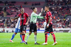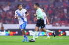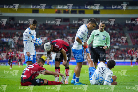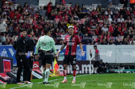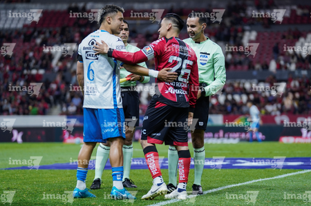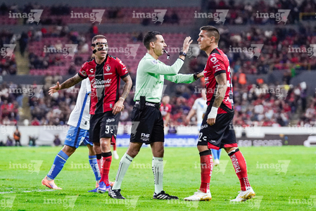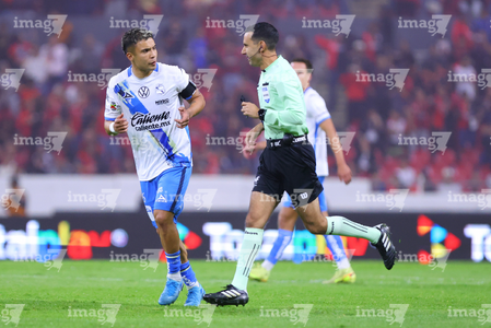 Guadalajara, Jalisco, 9 de enero de 2026. Nicolás Díaz y César Arturo Ramos, árbitro central, durante el partido correspondiente a la jornada 1 del torneo Clausura 2026 de la Liga BBVA MX, entre los Rojinegros del Atlas y el Club Puebla, realizado en el estadio Jalisco. Foto: Imago7/ Juan Carlos Cubeyro.