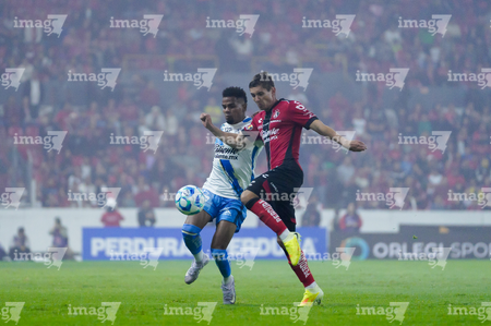 Guadalajara, Jalisco, 9 de enero de 2026. Aldo Rocha y Owen González, durante el partido correspondiente a la jornada 1 del torneo Clausura 2026 de la Liga BBVA MX, entre los Rojinegros del Atlas y el Club Puebla, realizado en el estadio Jalisco. Foto: Imago7/ Juan Carlos Cubeyro.