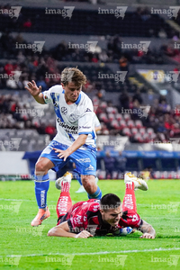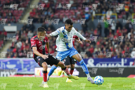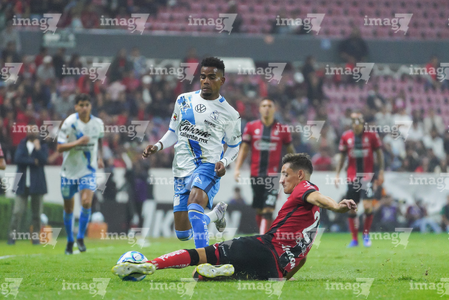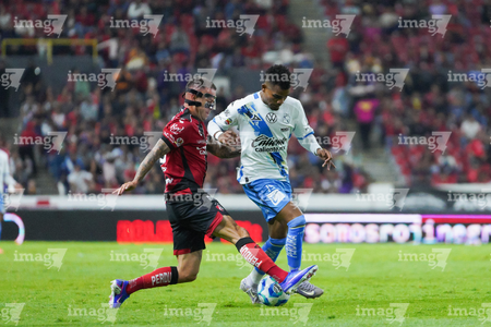 Guadalajara, Jalisco, 9 de enero de 2026. Nicolás Díaz y Paulo Ramirez, durante el partido correspondiente a la jornada 1 del torneo Clausura 2026 de la Liga BBVA MX, entre los Rojinegros del Atlas y el Club Puebla, realizado en el estadio Jalisco. Foto: Imago7/ Hugo Ramirez