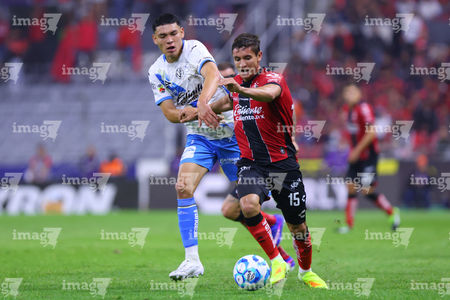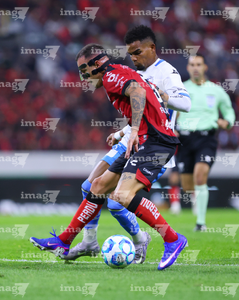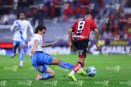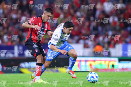 Guadalajara, Jalisco, 9 de enero de 2026. Gaddi Aguirre y Emiliano Gómez, durante el partido correspondiente a la jornada 1 del torneo Clausura 2026 de la Liga BBVA MX, entre los Rojinegros del Atlas y el Club Puebla, realizado en el estadio Jalisco. Foto: Imago7/ Alejandro Lias