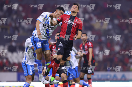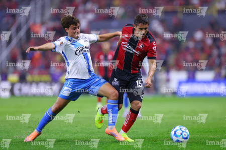 Guadalajara, Jalisco, 9 de enero de 2026. Gustavo Ferrareis y Edgar Guerra, durante el partido correspondiente a la jornada 1 del torneo Clausura 2026 de la Liga BBVA MX, entre los Rojinegros del Atlas y el Club Puebla, realizado en el estadio Jalisco. Foto: Imago7/ Juan Carlos Cubeyro.