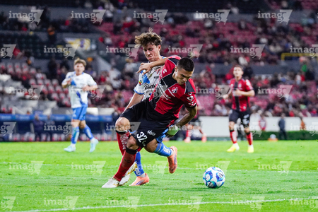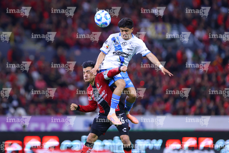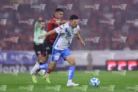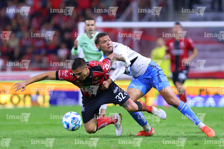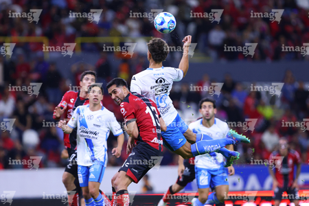 Guadalajara, Jalisco, 9 de enero de 2026. Nicolás Díaz y Uros Durdevic, durante el partido correspondiente a la jornada 1 del torneo Clausura 2026 de la Liga BBVA MX, entre los Rojinegros del Atlas y el Club Puebla, realizado en el estadio Jalisco. Foto: Imago7/ Alejandro Lias