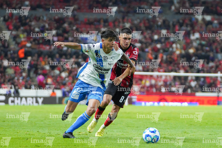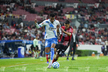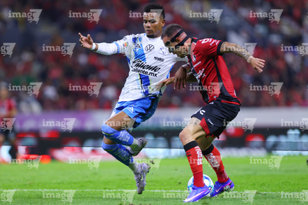 Guadalajara, Jalisco, 9 de enero de 2026. Edgar Guerra y Eduardo Aguirre, durante el partido correspondiente a la jornada 1 del torneo Clausura 2026 de la Liga BBVA MX, entre los Rojinegros del Atlas y el Club Puebla, realizado en el estadio Jalisco. Foto: Imago7/ Alejandro Lias