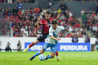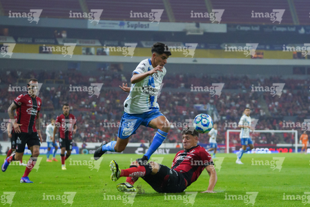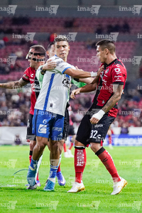 Guadalajara, Jalisco, 9 de enero de 2026. Edgar Guerra y Gustavo Ferrareis, durante el partido correspondiente a la jornada 1 del torneo Clausura 2026 de la Liga BBVA MX, entre los Rojinegros del Atlas y el Club Puebla, realizado en el estadio Jalisco. Foto: Imago7/ Juan Carlos Cubeyro.