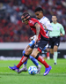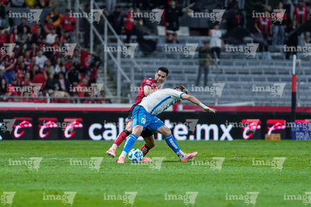 Guadalajara, Jalisco, 9 de enero de 2026. Uros Durdevic y Eduardo Navarro, durante el partido correspondiente a la jornada 1 del torneo Clausura 2026 de la Liga BBVA MX, entre los Rojinegros del Atlas y el Club Puebla, realizado en el estadio Jalisco. Foto: Imago7/ Juan Carlos Cubeyro.