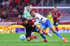 Guadalajara, Jalisco, 9 de enero de 2026. Mateo García y Carlos Baltazar, durante el partido correspondiente a la jornada 1 del torneo Clausura 2026 de la Liga BBVA MX, entre los Rojinegros del Atlas y el Club Puebla, realizado en el estadio Jalisco. Foto: Imago7/ Juan Carlos Cubeyro.
