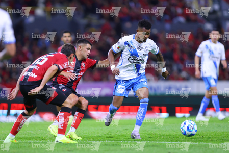 Guadalajara, Jalisco, 9 de enero de 2026. Paulo Ramírez, Gaddi Aguirre y Diego González, durante el partido correspondiente a la jornada 1 del torneo Clausura 2026 de la Liga BBVA MX, entre los Rojinegros del Atlas y el Club Puebla, realizado en el estadio Jalisco. Foto: Imago7/ Juan Carlos Cubeyro.