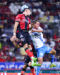 Guadalajara, Jalisco, 9 de enero de 2026. Eduardo Navarro y Eduardo Aguirre, durante el partido correspondiente a la jornada 1 del torneo Clausura 2026 de la Liga BBVA MX, entre los Rojinegros del Atlas y el Club Puebla, realizado en el estadio Jalisco. Foto: Imago7/ Juan Carlos Cubeyro.