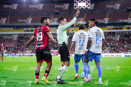 Guadalajara, Jalisco, 9 de enero de 2026. César Arturo Ramos, árbitro central, muestra tarjeta amarilla de amonestación a Edgar Guerra, durante el partido correspondiente a la jornada 1 del torneo Clausura 2026 de la Liga BBVA MX, entre los Rojinegros del Atlas y el Club Puebla, realizado en el estadio Jalisco. Foto: Imago7/ Alejandro Lias