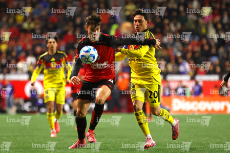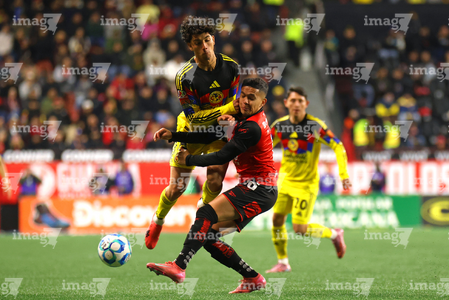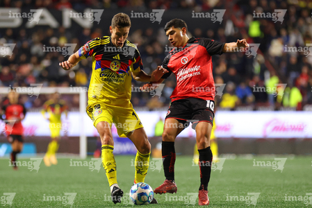 Tijuana, Baja California, 9 de enero de 2026. Alvaro Fidalgo e Ivan Tona, durante el partido correspondiente a la jornada 1 del torneo Clausura 2026 de la Liga BBVA MX, entre los Xolos de Tijuana y las Águilas del América, realizado en el estadio Caliente. Foto: Imago7/Alejandro Gutiérrez Mora