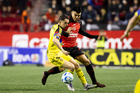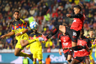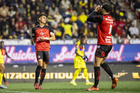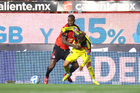 Tijuana, Baja California, 9 de enero de 2026. Rodrigo Aguirre y Joe Corona, durante el partido correspondiente a la jornada 1 del torneo Clausura 2026 de la Liga BBVA MX, entre los Xolos de Tijuana y las Águilas del América, realizado en el estadio Caliente. Foto: Imago7/ David Vega