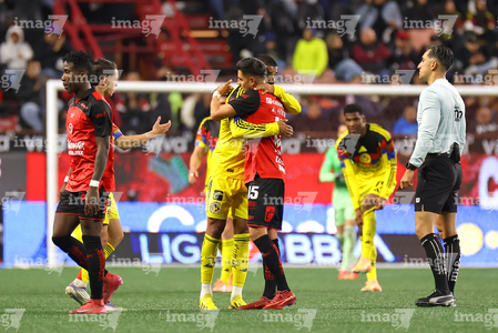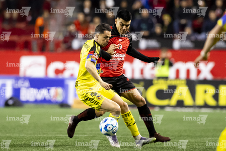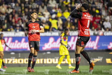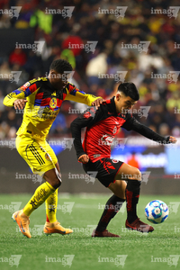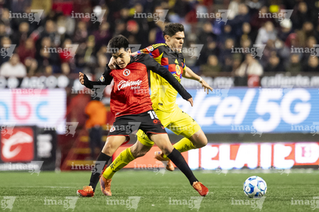 Tijuana, Baja California, 9 de enero de 2026. Unai Bilbao y Alexis Gutiérrez, durante el partido correspondiente a la jornada 1 del torneo Clausura 2026 de la Liga BBVA MX, entre los Xolos de Tijuana y las Águilas del América, realizado en el estadio Caliente. Foto: Imago7/ David Vega