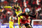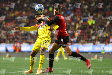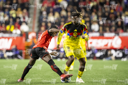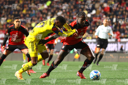 Tijuana, Baja California, 9 de enero de 2026. José Zuñiga y Jackson Porozo, durante el partido correspondiente a la jornada 1 del torneo Clausura 2026 de la Liga BBVA MX, entre los Xolos de Tijuana y las Águilas del América, realizado en el estadio Caliente. Foto: Imago7/ David Vega