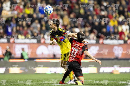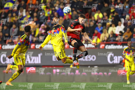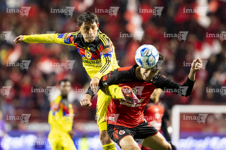 Tijuana, Baja California, 9 de enero de 2026. Rodrigo Aguirre y Rafael Fernández, durante el partido correspondiente a la jornada 1 del torneo Clausura 2026 de la Liga BBVA MX, entre los Xolos de Tijuana y las Águilas del América, realizado en el estadio Caliente. Foto: Imago7/ David Vega