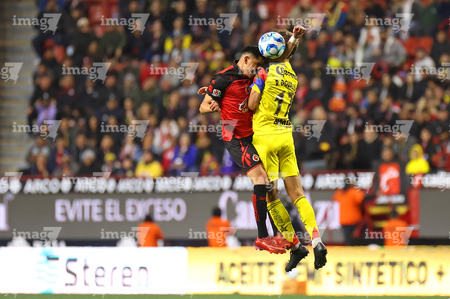 Tijuana, Baja California, 9 de enero de 2026. José Zuñiga y Unai Bilbao, durante el partido correspondiente a la jornada 1 del torneo Clausura 2026 de la Liga BBVA MX, entre los Xolos de Tijuana y las Águilas del América, realizado en el estadio Caliente. Foto: Imago7/ David Vega