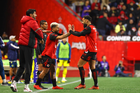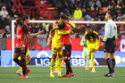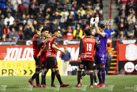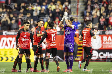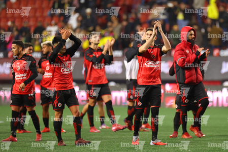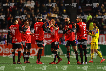 Tijuana, Baja California, 9 de enero de 2026. Jugadores de Xolos, durante el partido correspondiente a la jornada 1 del torneo Clausura 2026 de la Liga BBVA MX, entre los Xolos de Tijuana y las Águilas del América, realizado en el estadio Caliente. Foto: Imago7/ David Vega