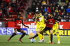 Tijuana, Baja California, 9 de enero de 2026. Rodrigo Aguirre, Brian Rodríguez y Kevin Álvarez, durante el partido correspondiente a la jornada 1 del torneo Clausura 2026 de la Liga BBVA MX, entre los Xolos de Tijuana y las Águilas del América, realizado en el estadio Caliente. Foto: Imago7/Alejandro Gutiérrez Mora