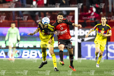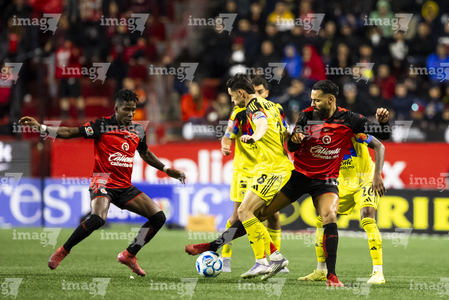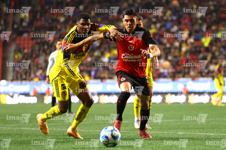 Tijuana, Baja California, 9 de enero de 2026. José Zuñiga e Iván Tona, durante el partido correspondiente a la jornada 1 del torneo Clausura 2026 de la Liga BBVA MX, entre los Xolos de Tijuana y las Águilas del América, realizado en el estadio Caliente. Foto: Imago7/ David Vega