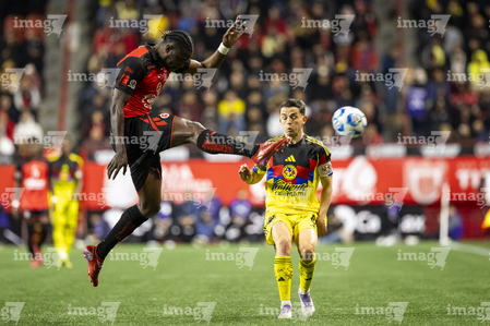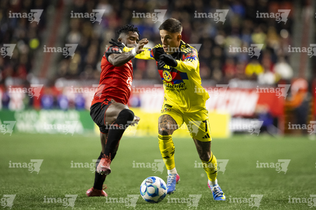 Tijuana, Baja California, 9 de enero de 2026. Adonis Preciado y Allan Saint-Maximin, durante el partido correspondiente a la jornada 1 del torneo Clausura 2026 de la Liga BBVA MX, entre los Xolos de Tijuana y las Águilas del América, realizado en el estadio Caliente. Foto: Imago7/Alejandro Gutiérrez Mora